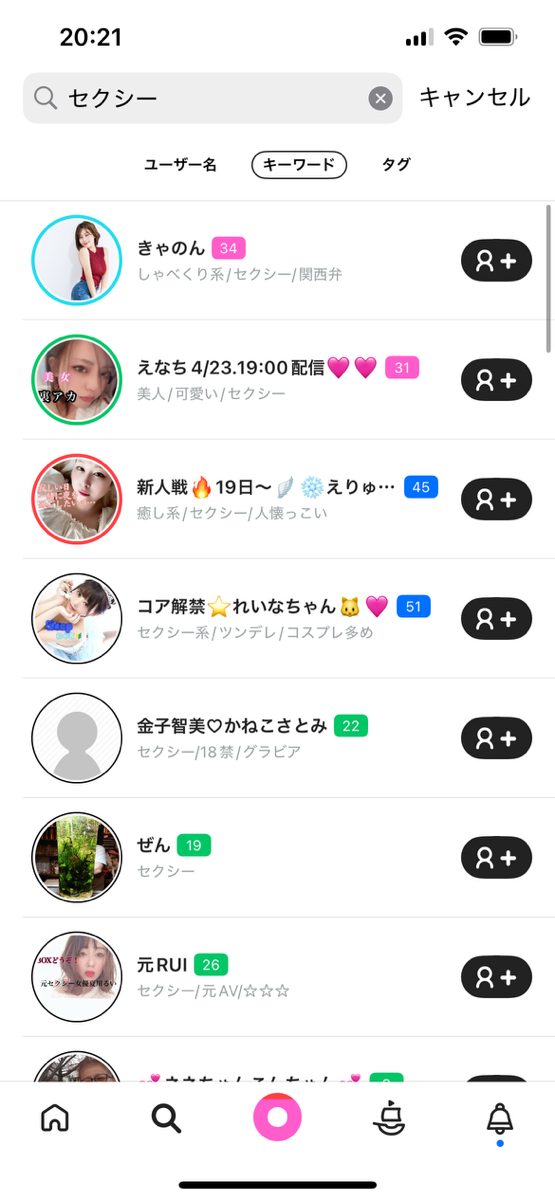 ここで気になる人を探しましょう。この画像だと「元RUI」さんは元AVと書かれており、過去にAVに出演されていたようなセクシー系ライバーだとわかります。
