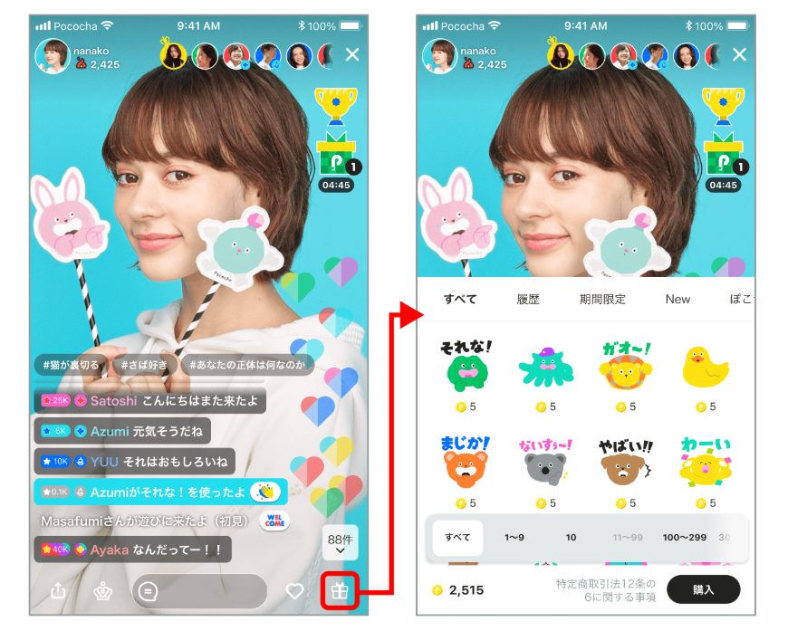ポコチャでは、基本的にライバーの配信を無料で視聴できますが、アプリ内通貨「コイン」を使って応援アイテムを贈ることで、配信をさらに楽しめる仕組みがあります。