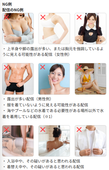 具体的には、露出が多い衣装や裸を連想させるような格好での配信は認められていません。